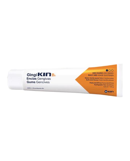 INDICACIONES:\r\nPrevención y control de la placa dental y la gingivitis. Mantenimiento del tejido gingival. Prevención de la caries.\r\n\r\nINGREDIENTES:\r\nSu fórmula con triclosán (agente antiséptico), provitamina B5 y sal de zinc actúa controlando los microorganismos del biofilm dental, a la vez que protege y revitaliza la encía. Por otro lado contiene flúor para una eficaz protección anticaries.\r\n\r\nMODO DE EMPLEO:\r\nCepillarse los dientes durante 2 ó 3 minutos, como mínimo 2 veces al día, preferentemente después de cada comida y antes de acostarse. No ingerir.\r\n\r\nPRECAUCIONES y ADVERTENCIAS:\r\nMantener fuera del alcance de los niños.\r\n\r\nFuente LAB. KIN: https://www.kin.es/ES/health_care/2a16b9c36/denjpgricos/gingi-kin-b5-pasta-denjpgrica.html\r\nFuente: Consejo General de Colegios Oficiales Farmacéuticos (CGCOF)