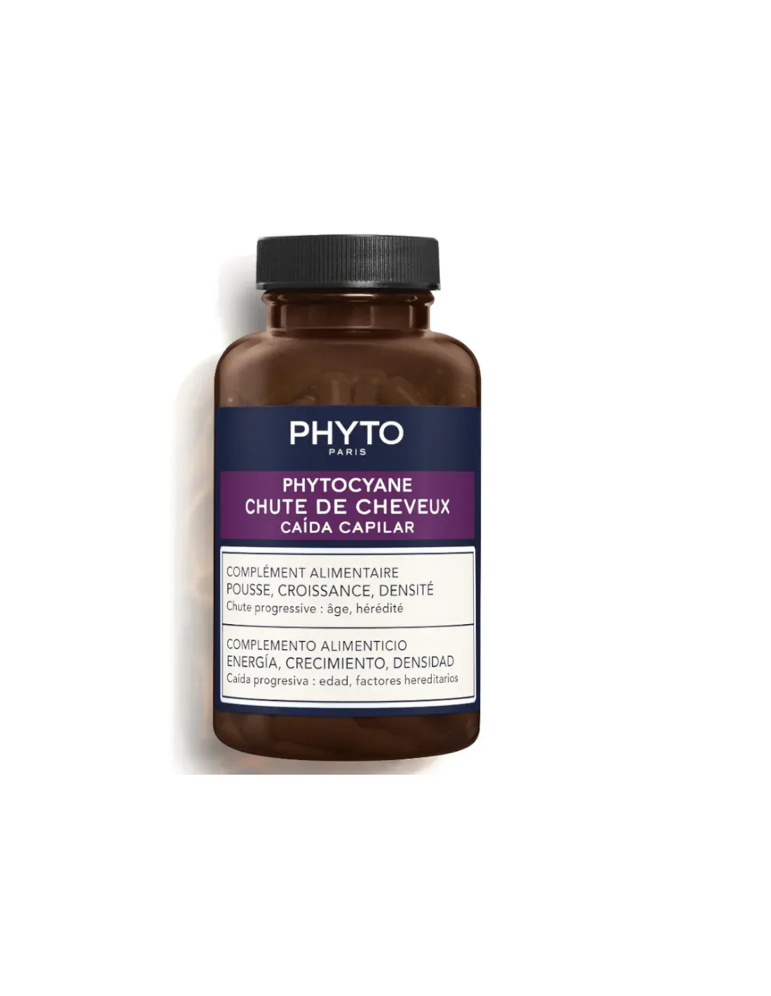 Frena la caída del cabello con el nuevo suplemento alimenticio anticaída PHYTOCYANE. Producto de la investigación anticaída de PHYTO, su potente fórmula con resultados clínicos excepcionales actúa contra las 3 causas biológicas responsables de la caída progresiva y severa.\r\n\r\nLos FITOESTEROLES DE PINO, junto con el GLUCONATO DE ZINC (la forma más biodisponible del zinc), actúan sobre la vía hormonal inhibiendo la enzima 5 alfa reductasa, responsable de la miniaturización de los folículos y de la aceleración de la caída.\r\n\r\nLa TAURINA, el aminoácido azufrado más presente en la vaina del folículo, se dirige a la vía tisular protegiendo el bulbo. Permite un mejor anclaje y un engrosamiento de la fibra.\r\n\r\nLos POLIFENOLES DE UVA actúan sobre la vía vascular mejorando la microcirculación capilar para aportar nutrientes a los folículos y preservar su integridad.\r\n\r\nVentajas de la fórmula : Fórmula VEGANA. Sin lactosa, gluten, conservantes, edulcorantes, cacahuetes ni huevos.