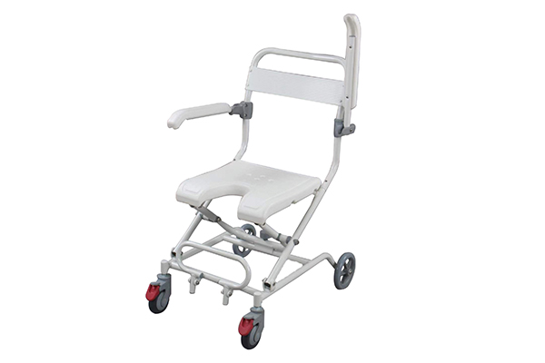Silla de baño plegable y desmontable. Estructura de aluminio y asiento moldeado en plástico PE. Con reposabrazos y reposapiés plegables y reposabrazos abatible para facilitar\r\nla transferencia.Tiene 4 ruedas, las dos delanteras con freno que garantizan una óptima estabilidad y seguridad a la hora del aseo al paciente. Gran facilidad de transporte .
