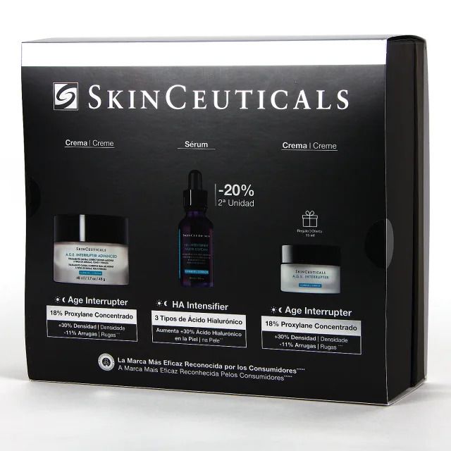 El cofre A.G.E Interrupter Advanced + HA Intensifier de SkinCeuticals es un tratamiento avanzado diseñado para combatir los signos visibles del envejecimiento de la piel. Este innovador set incluye dos productos clave que trabajan en sinergia para mejorar la elasticidad, la hidratación y la apariencia general de la piel.