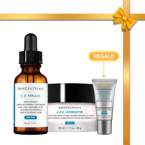 Este protocolo combina el 15% de Vitamina C pura de C E Ferulic con el tratamiento antiedad multiacción de A.G.E. Interrupter, y la fotoprotección de Advanced Brightening SPF 50 de regalo para obtener los mejores resultados antiarrugas y una mayor firmeza en la piel.\r\n\r\nC E FERULIC:\r\n\r\nSérum antioxidante con vitamina C pura que minimiza las arrugas (-36%), reafirma la piel (+37%), y aporta luminosidad a la piel (+44%).\r\n\r\nA.G.E. INTERRUPTER:\r\n\r\nTratamiento antiedad multiacción formulado para mejorar los signos visibles del envejecimiento causados por los productos finales de la glicación avanzada\r\n\r\nADVANCED BRIGHTENING UV DEFENSE SUNSCREEN SPF 50:\r\n\r\nFotoprotector de uso diario que protege contra los daños provocados por el Sol al tiempo que reduce la hiperpigmentación existente.