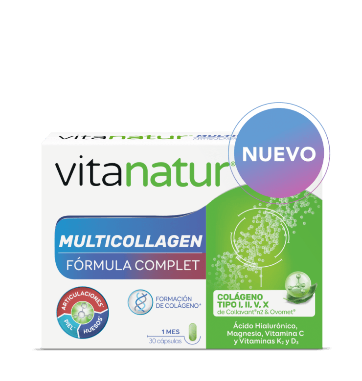 Vitanatur MULTICOLLAGEN, complemento alimenticio en cápsulas a base de colágeno tipo II, membrana de cáscara de huevo en polvo (que contiene colágeno de tipo I, V y X, elastina, ácido hialurónico, condroitín sulfato y glucosamina), ácido hialurónico, vitaminas C, K2 y D3 y magnesio.